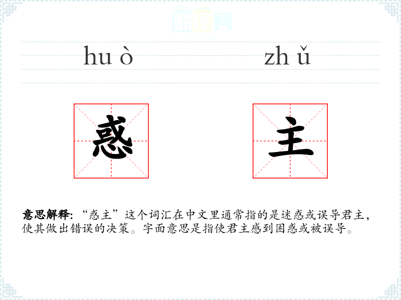 “惑主”这个词汇在中文里通常指的是迷惑或误导君主,使其做出错误的决策。字面意思是指使君主感到困惑或被误导。