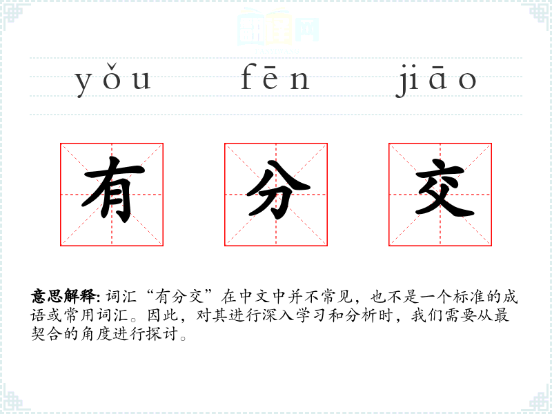 由于“有分交”不是一个明确或标准的词汇,我们无法对其进行深入的分析和理解。在语言学习和表达中,遇到不明确的词汇时,应首先确认其来源和确切含义,以避免误解和混淆。