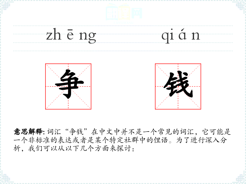 词汇“争钱”在中文中并不是一个常见的词汇,它可能是一个非标准的表达或者是某个特定社群中的俚语。为了进行深入分析,我们可以从以下几个方面来探讨: