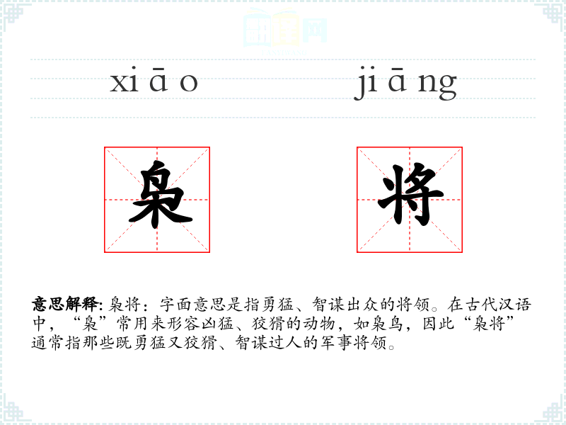 - 专业领域:在军事或历史研究中,“枭将”可能被用来指代那些在战争中表现出色的将领。