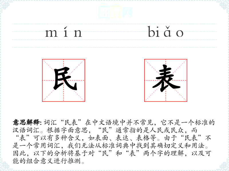 词汇“民表”在中文语境中并不常见,它不是一个标准的汉语词汇。根据字面意思,“民”通常指的是人民或民众,而“表”可以有多种含义,如表面、表达、表格等。由于“民表”不是一个常用词汇,我们无法从标准词典中找到其确切定义和用法。因此,以下的分析将基于对“民”和“表”两个字的理解,以及可能的组合意义进行推测。