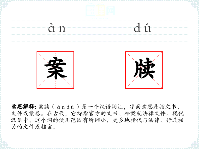 案牍(àn dú)是一个汉语词汇,字面意思是指文书、文件或案卷。在古代,它特指官方的文书、档案或法律文件。现代汉语中,这个词的使用范围有所缩小,更多地指代与法律、行政相关的文件或档案。