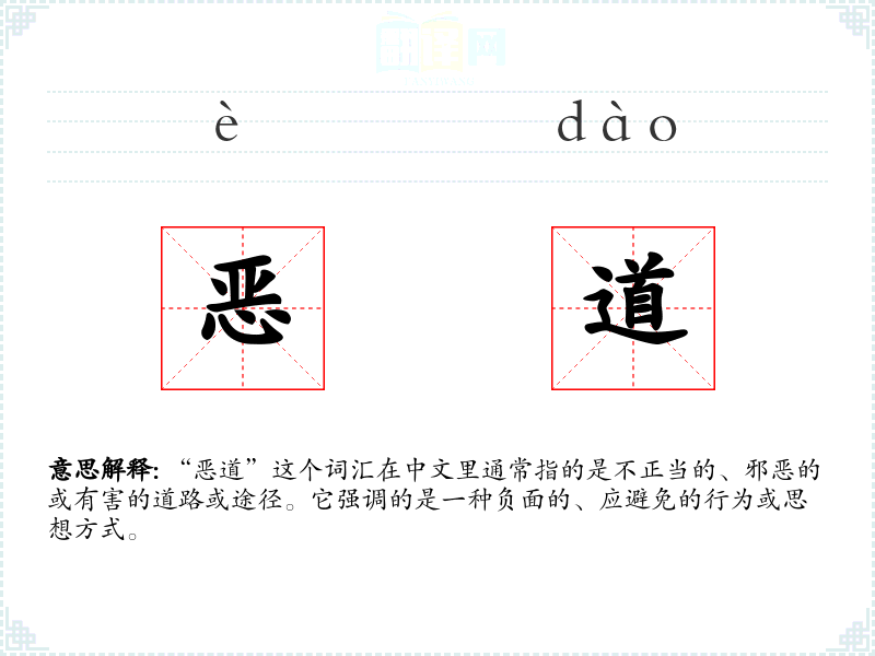 “恶道”由“恶”和“道”两个字组成。“恶”字自古以来就有不好的、邪恶的意思,“道”字最初指道路,后来扩展到方法、途径等含义。组合起来,“恶道”即指不好的途径或方法。