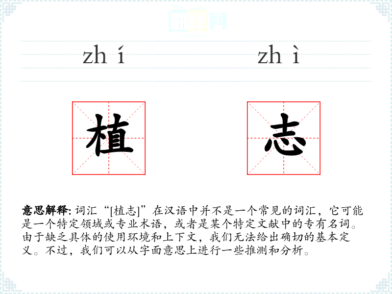 词汇“[植志]”在汉语中并不是一个常见的词汇,它可能是一个特定领域或专业术语,或者是某个特定文献中的专有名词。由于缺乏具体的使用环境和上下文,我们无法给出确切的基本定义。不过,我们可以从字面意思上进行一些推测和分析。