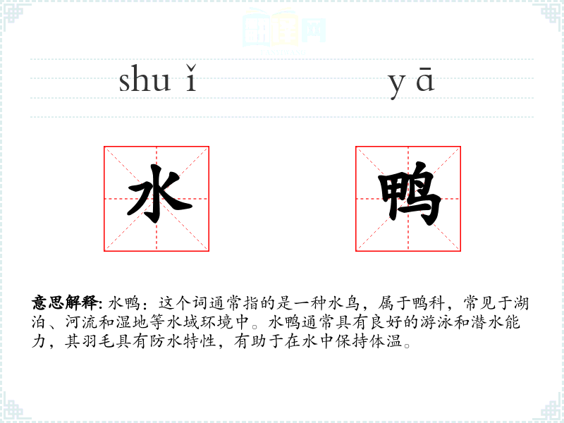 水鸭:这个词通常指的是一种水鸟,属于鸭科,常见于湖泊、河流和湿地等水域环境中。水鸭通常具有良好的游泳和潜水能力,其羽毛具有防水特性,有助于在水中保持体温。