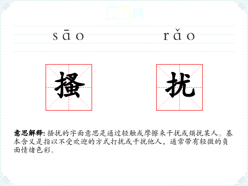 搔扰的字面意思是通过轻触或摩擦来干扰或烦扰某人。基本含义是指以不受欢迎的方式打扰或干扰他人,通常带有轻微的负面情绪色彩。