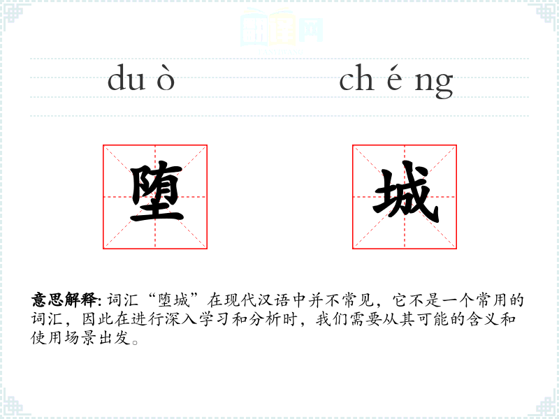 词汇“堕城”在现代汉语中并不常见,它不是一个常用的词汇,因此在进行深入学*和分析时,我们需要从其可能的含义和使用场景出发。