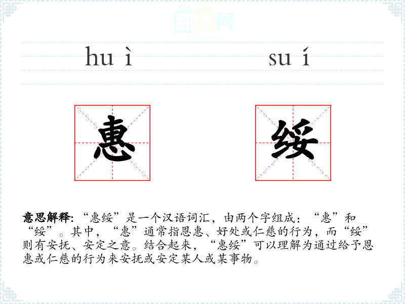 “惠绥”是一个汉语词汇,由两个字组成:“惠”和“绥”。其中,“惠”通常指恩惠、好处或仁慈的行为,而“绥”则有安抚、安定之意。结合起来,“惠绥”可以理解为通过给予恩惠或仁慈的行为来安抚或安定某人或某事物。