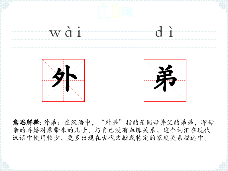 外弟:在汉语中,“外弟”指的是同母异父的弟弟,即母亲的再婚对象带来的儿子,与自己没有血缘关系。这个词汇在现代汉语中使用较少,更多出现在古代文献或特定的家庭关系描述中。