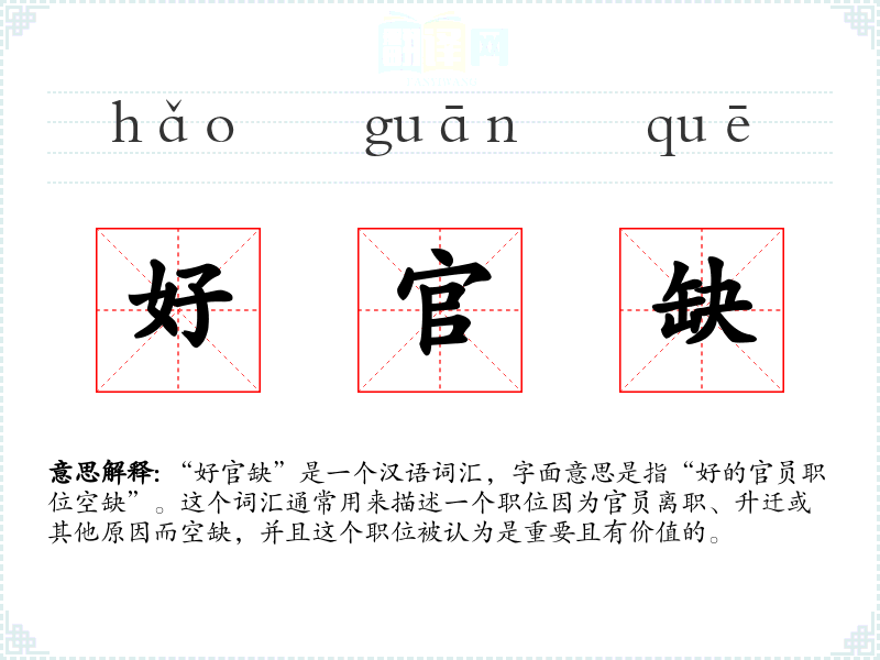 “好官缺”是一个汉语词汇,字面意思是指“好的官员职位空缺”。这个词汇通常用来描述一个职位因为官员离职、升迁或其他原因而空缺,并且这个职位被认为是重要且有价值的。