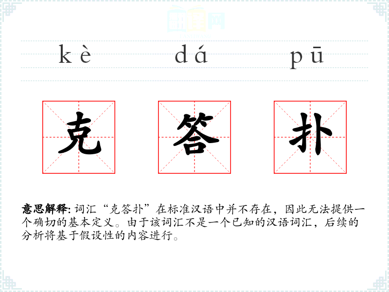 词汇“克答扑”在标准汉语中并不存在,因此无法提供一个确切的基本定义。由于该词汇不是一个已知的汉语词汇,后续的分析将基于假设性的内容进行。