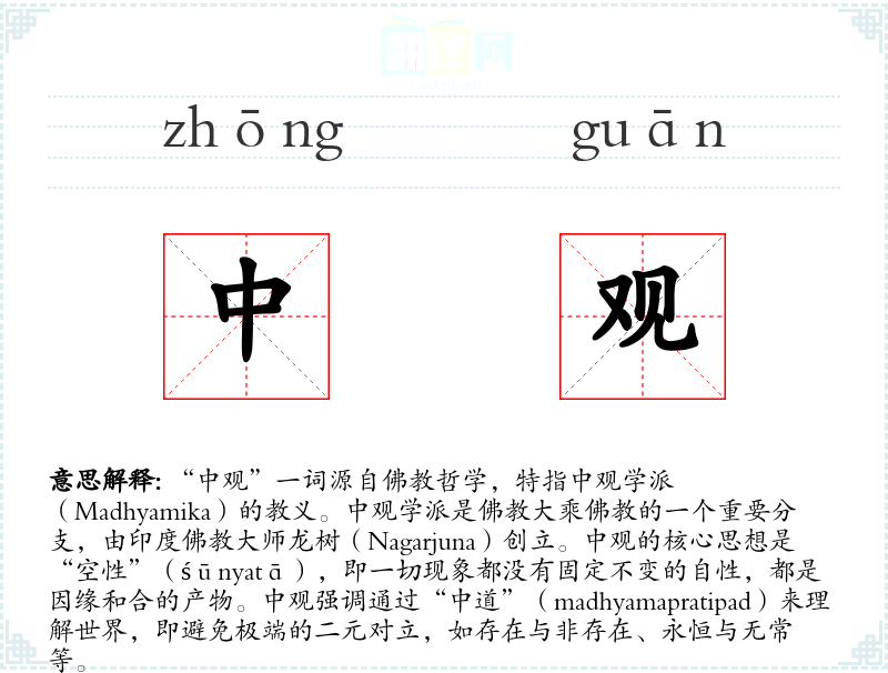 “中观”一词源自哲学,特指中观学派(Madhyamika)的教义。中观学派是大乘的一个重要分支,由印度大师龙树(Nagarjuna)创立。中观的核心思想是“空性”(śūnyatā),即一切现象都没有固定不变的自性,都是因缘和合的产物。中观强调通过“中道”(madhyamapratipad)来理解世界,即避免极端的二元对立,如存在与非存在、永恒与无常等。