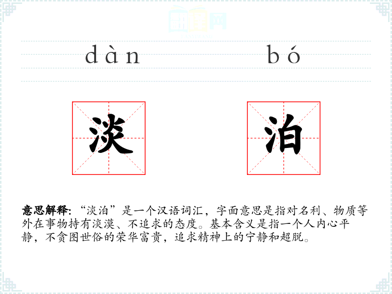 “淡泊”是一个汉语词汇,字面意思是指对名利、物质等外在事物持有淡漠、不追求的态度。基本含义是指一个人内心平静,不贪图世俗的荣华富贵,追求精神上的宁静和超脱。