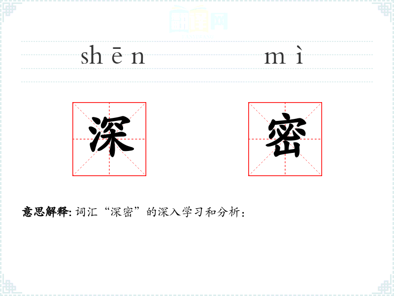 “深密”一词由“深”和“密”两个字组成,“深”指深度或深奥,“密”指紧密或隐秘。在古代汉语中,这两个字常一起使用来形容事物的难以理解或接近。