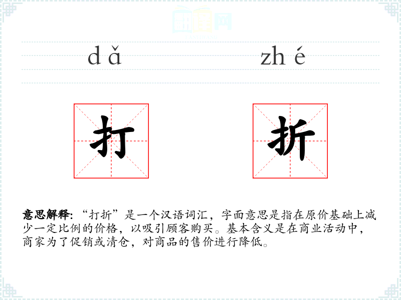 “打折”是一个汉语词汇,字面意思是指在原价基础上减少一定比例的价格,以吸引顾客购买。基本含义是在商业活动中,商家为了促销或清仓,对商品的售价进行降低。