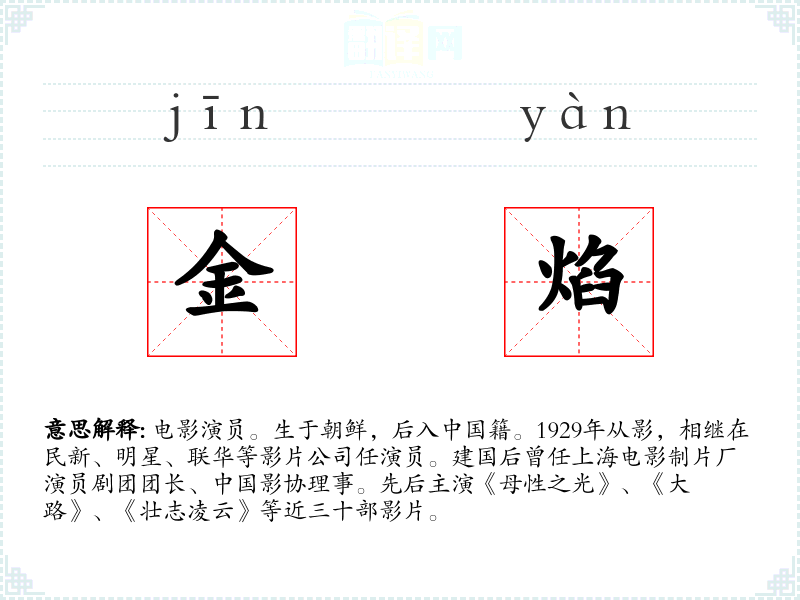 1.电影演员。生于朝鲜,后入中国籍。1929年从影,相继在民新、明星、联华等影片公司任演员。建国后曾任上海电影制片厂演员剧团团长、中国影协理事。先后主演《母性之光》、《大路》、《壮志凌云》等近三十部影片。