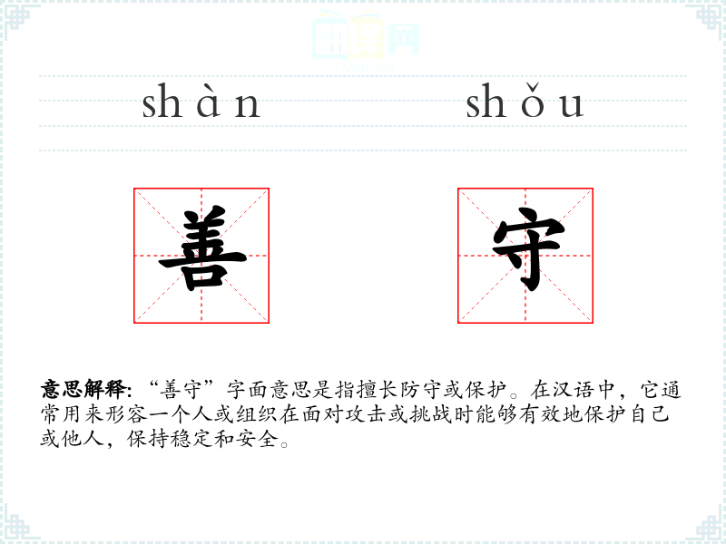 “善守”字面意思是指擅长防守或保护。在汉语中,它通常用来形容一个人或组织在面对攻击或挑战时能够有效地保护自己或他人,保持稳定和安全。