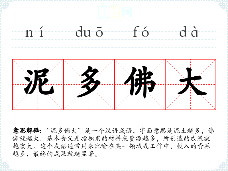 “泥多佛大”是一个汉语成语,字面意思是泥土越多,佛像就越大。基本含义是指积累的材料或资源越多,所创造的成果就越宏大。这个成语通常用来比喻在某一领域或工作中,投入的资源越多,最终的成果就越显著。