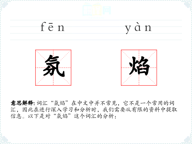 由于“氛焰”不是一个常用词汇,它在文学作品中可能出现,用以形容某种强烈的情感或**的氛围。在口语或专业领域中,这个词汇可能不太常见。