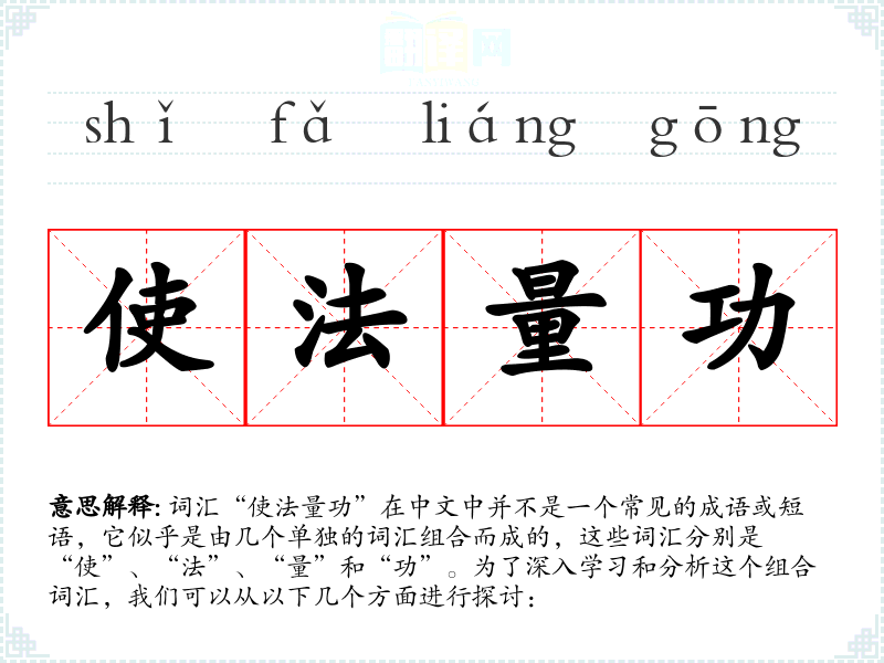 词汇“使法量功”在中文中并不是一个常见的成语或短语,它似乎是由几个单独的词汇组合而成的,这些词汇分别是“使”、“法”、“量”和“功”。为了深入学*和分析这个组合词汇,我们可以从以下几个方面进行探讨: