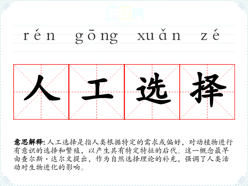 - 专业领域:在生物学、农业科学和遗传学中,人工选择是一个核心概念,用于解释物种多样性和农业生产中的品种改良。