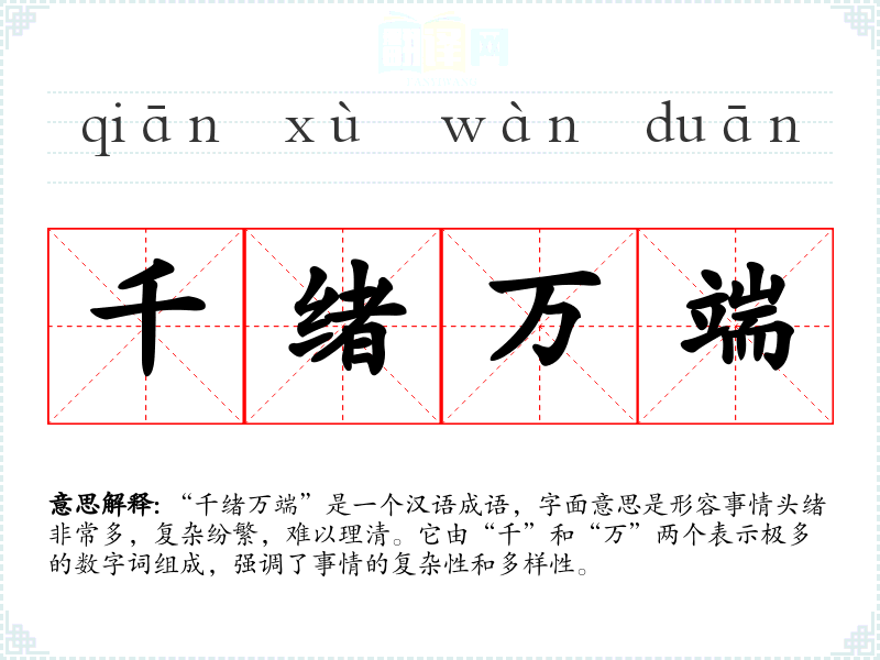 “千绪万端”是一个汉语成语,字面意思是形容事情头绪非常多,复杂纷繁,难以理清。它由“千”和“万”两个表示极多的数字词组成,强调了事情的复杂性和多样性。