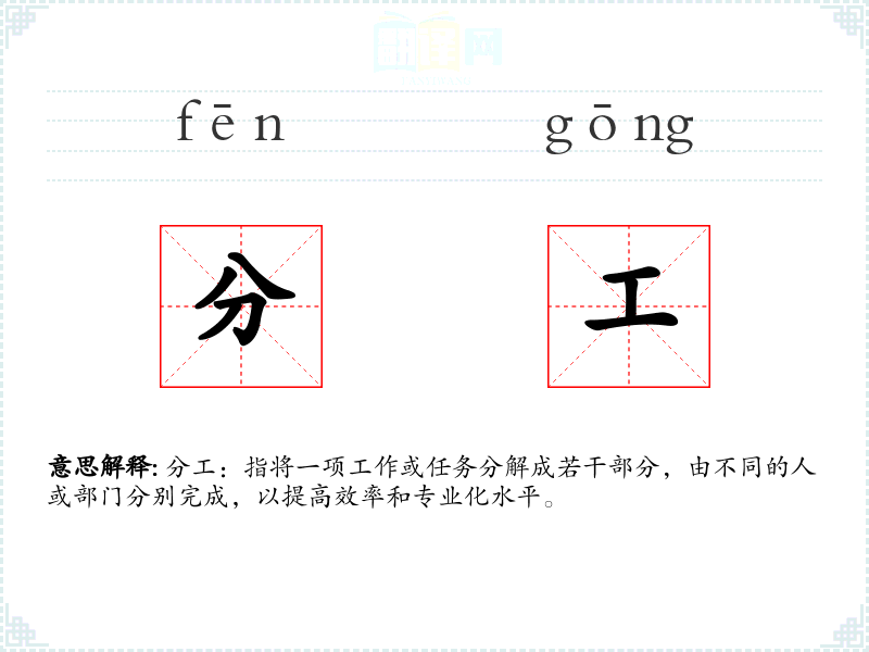 分工:指将一项工作或任务分解成若干部分,由不同的人或部门分别完成,以提高效率和专业化水平。