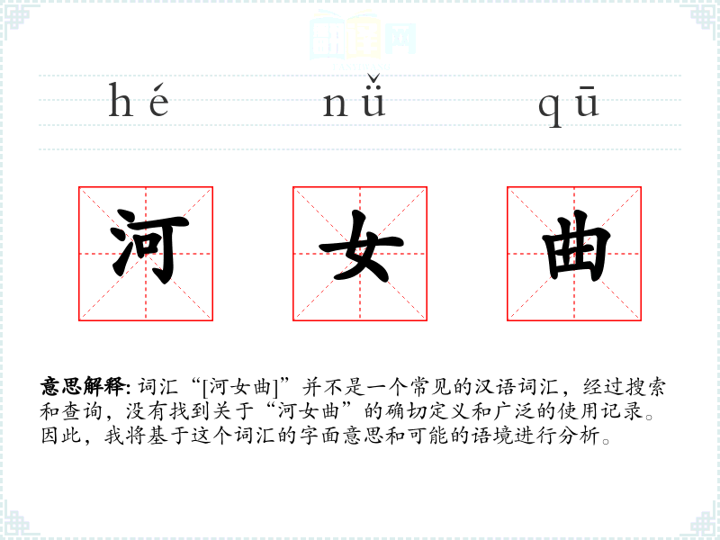 词汇“[河女曲]”并不是一个常见的汉语词汇,经过搜索和查询,没有找到关于“河女曲”的确切定义和广泛的使用记录。因此,我将基于这个词汇的字面意思和可能的语境进行分析。