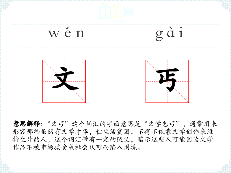 “文丐”这个词汇的字面意思是“文学乞丐”,通常用来形容那些虽然有文学才华,但生活贫困,不得不依靠文学创作来维持生计的人。这个词汇带有一定的贬义,暗示这些人可能因为文学作品不被市场接受或社会认可而陷入困境。