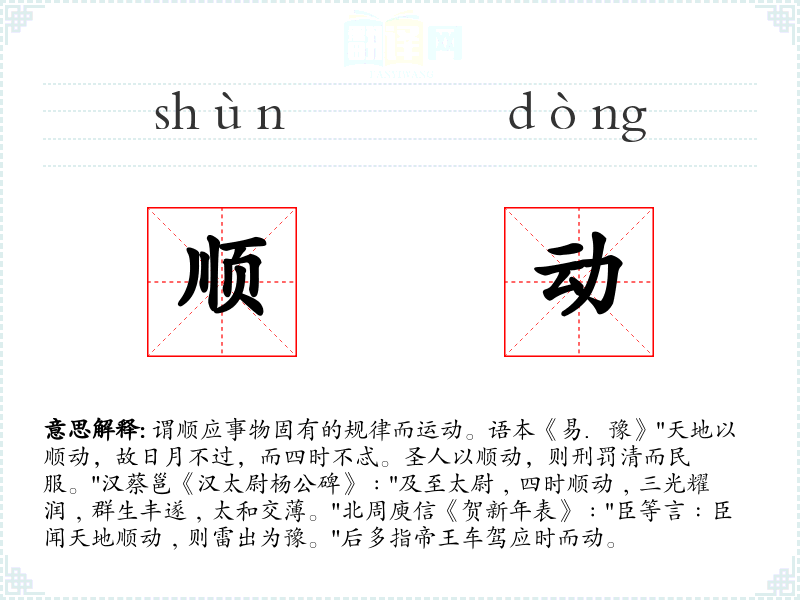 1.谓顺应事物固有的规律而运动。语本《易.豫》"天地以顺动,故日月不过,而四时不忒。圣人以顺动,则刑罚清而民服。"汉蔡邕《汉太尉杨公碑》﹕"及至太尉﹐四时顺动﹐三光耀润﹐群生丰遂﹐太和交薄。"北周庾信《贺新年表》﹕"臣等言﹕臣闻天地顺动﹐则雷出为豫。"后多指帝王车驾应时而动。