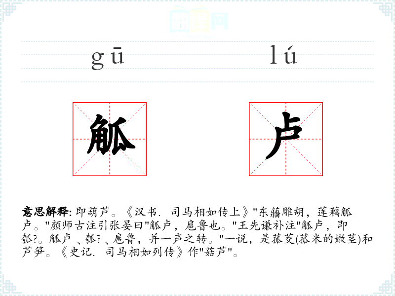 1.即葫芦。《汉书.司马相如传上》"东蘠雕胡,莲藕觚卢。"颜师古注引张晏曰"觚卢,扈鲁也。"王先谦补注"觚卢,即瓠?。觚卢﹑瓠?﹑扈鲁,并一声之转。"一说,是菰茭(菰米的嫩茎)和芦笋。《史记.司马相如列传》作"菇芦"。