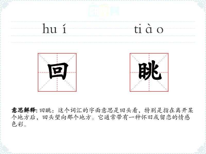 “回眺”由“回”和“眺”两个字组成。“回”字古已有之,表示返回或回转;“眺”字则表示远望。两个字结合,形成了表示回头看的动作。