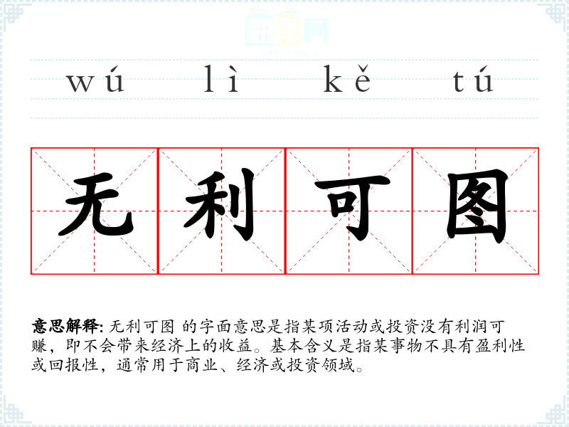 无利可图 的字面意思是指某项活动或投资没有利润可赚,即不会带来经济上的收益。基本含义是指某事物不具有盈利性或回报性,通常用于商业、经济或投资领域。
