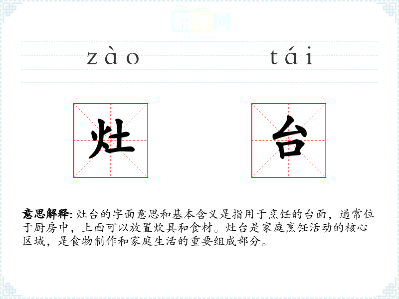 灶台的字面意思和基本含义是指用于烹饪的台面,通常位于厨房中,上面可以放置炊具和食材。灶台是家庭烹饪活动的核心区域,是食物制作和家庭生活的重要组成部分。