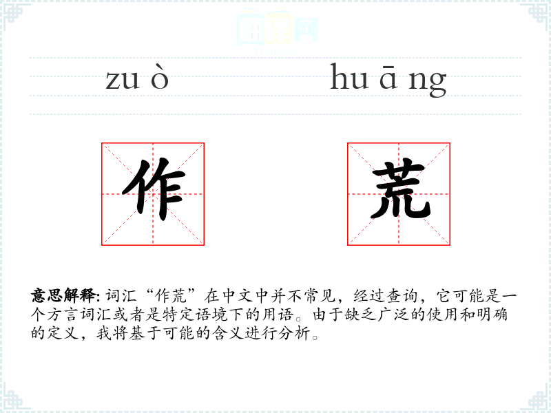 词汇“作荒”在中文中并不常见,经过查询,它可能是一个方言词汇或者是特定语境下的用语。由于缺乏广泛的使用和明确的定义,我将基于可能的含义进行分析。