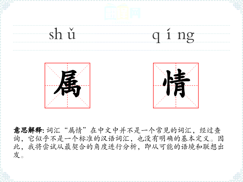 由于“属情”不是一个标准词汇,我们无法给出一个确切的字面意思和基本含义。但从字面上理解,“属”通常与归属、属于有关,“情”则与情感、情绪相关。结合起来,“属情”可能指的是与某种情感或情绪的归属感有关的概念。
