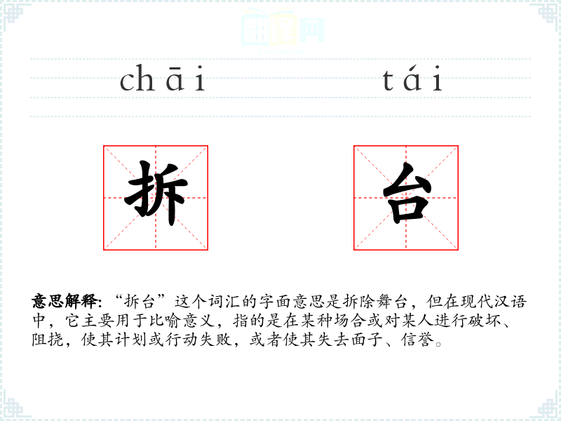 “拆台”这个词汇的字面意思是拆除舞台,但在现代汉语中,它主要用于比喻意义,指的是在某种场合或对某人进行破坏、阻挠,使其计划或行动失败,或者使其失去面子、信誉。