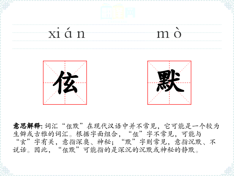 词汇“伭默”在现代汉语中并不常见,它可能是一个较为生僻或古雅的词汇。根据字面组合,“伭”字不常见,可能与“玄”字有关,意指深奥、神秘;“默”字则常见,意指沉默、不说话。因此,“伭默”可能指的是深沉的沉默或神秘的静默。