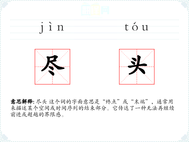 尽头 这个词的字面意思是“终点”或“末端”,通常用来描述某个空间或时间序列的结束部分。它传达了一种无法再继续前进或超越的界限感。