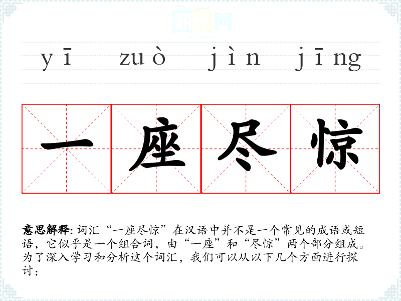 词汇“一座尽惊”在汉语中并不是一个常见的成语或短语,它似乎是一个组合词,由“一座”和“尽惊”两个部分组成。为了深入学习和分析这个词汇,我们可以从以下几个方面进行探讨: