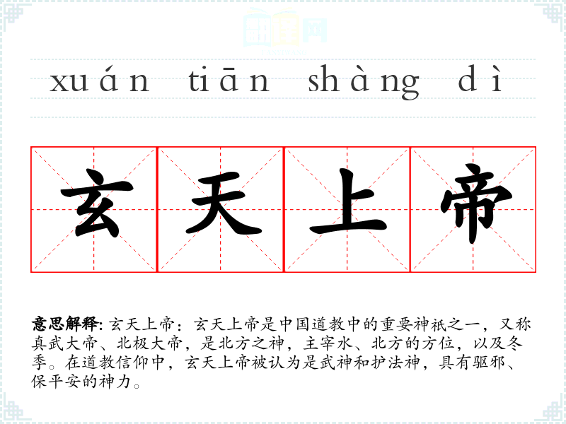 同义词:真武大帝、北极大帝 反义词:无直接反义词,但可以与代表南方、夏季的神祇如炎帝进行对比。