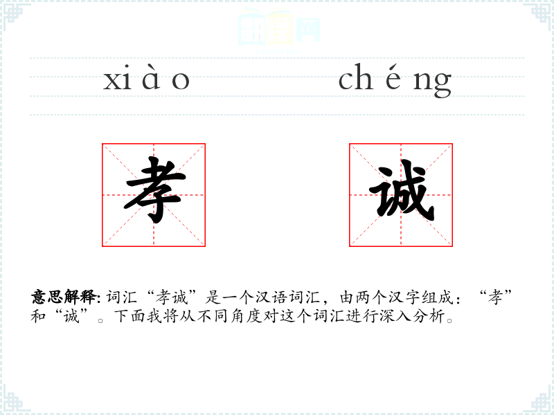 词汇“孝诚”是一个汉语词汇,由两个汉字组成:“孝”和“诚”。下面我将从不同角度对这个词汇进行深入分析。