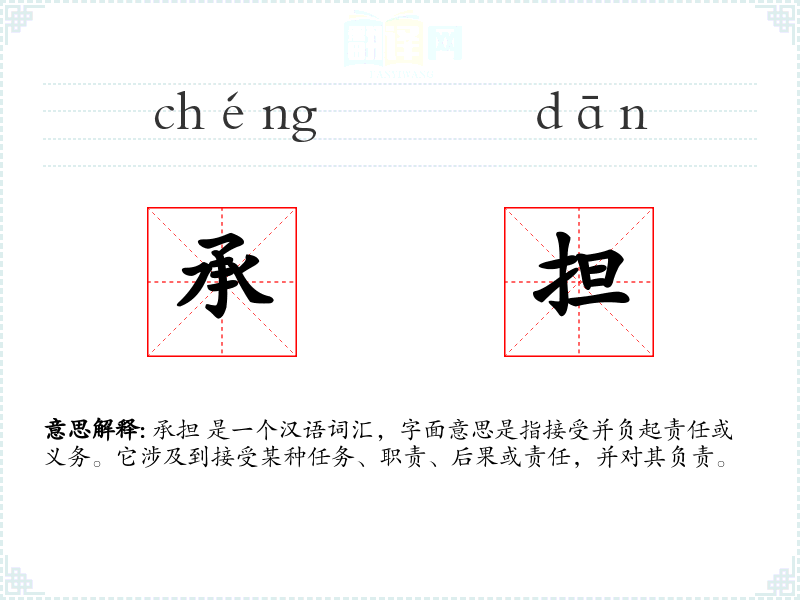 - 文学:在文学作品中,“承担”常常用来描述人物的勇气和责任感,如“他承担起了家族的重担”。