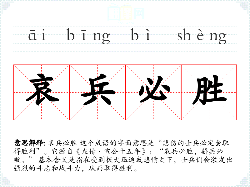 哀兵必胜 这个成语的字面意思是“悲伤的士兵必定会取得胜利”。它源自《左传·宣公十五年》:“哀兵必胜,骄兵必败。” 基本含义是指在受到极大压迫或悲愤之下,士兵们会激发出强烈的斗志和战斗力,从而取得胜利。