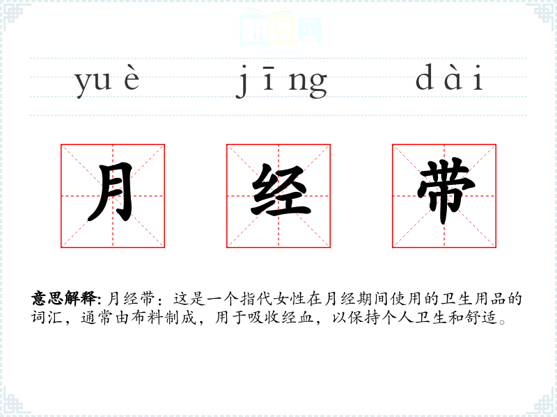 月经带:这是一个指代女性在月经期间使用的卫生用品的词汇,通常由布料制成,用于吸收经血,以保持个人卫生和舒适。