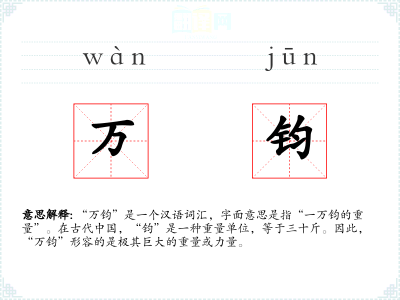 “万钧”这个词汇源自古代对重量的计量单位“钧”,随着时间的推移,它逐渐被用来形容任何极其巨大的力量或重量。在现代汉语中,这个词汇的使用相对固定,主要用于文学和修辞中。