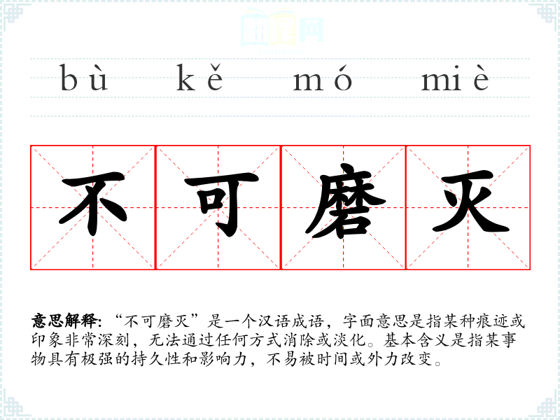 在英语中,类似的表达可以是“indelible”,意为“无法消除的,不可磨灭的”。这个词在英语中也常用来形容深刻的印象或记忆,但其使用范围和语境与汉语中的“不可磨灭”有所不同。