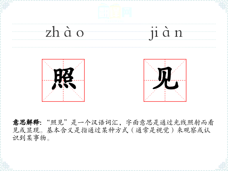 “照见”是一个汉语词汇,字面意思是通过光线照射而看见或显现。基本含义是指通过某种方式(通常是视觉)来观察或认识到某事物。