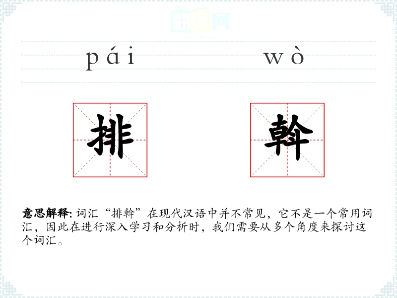 词汇“排斡”在现代汉语中并不常见,它不是一个常用词汇,因此在进行深入学*和分析时,我们需要从多个角度来探讨这个词汇。