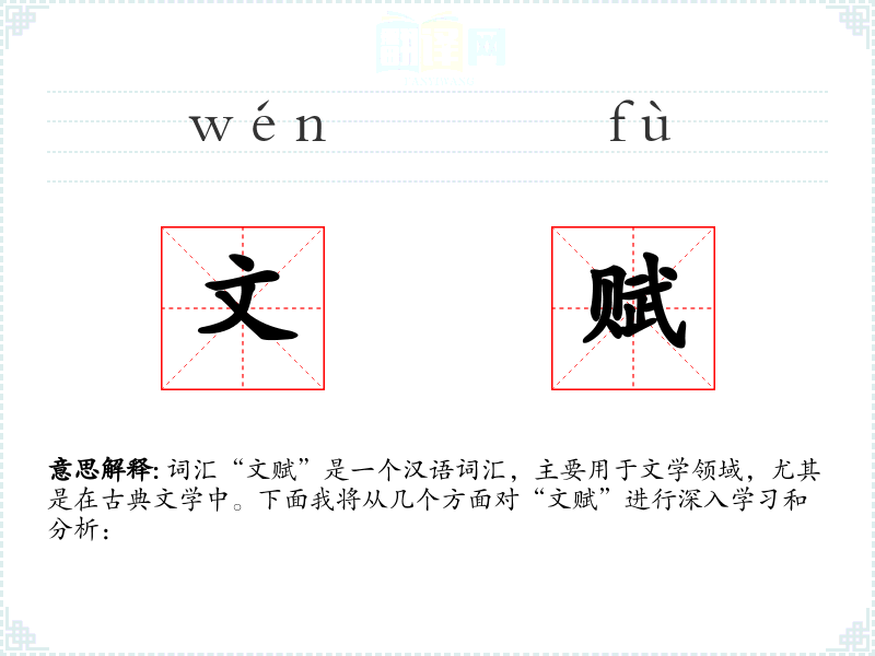 “文赋”字面意思是指用文雅的语言写成的赋文。赋是**古代一种文体,起源于战国时期,盛行于汉代,特点是讲究文采、韵律,通常用来描写景物、抒发情感或阐述哲理。